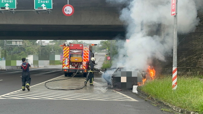 警方說,員警見狀駕車尾隨,該車往南逃逸至竹崎交流道不明原因失控自撞電線桿肇事,約3分鐘後車輛起火燃燒。經協助周男脫困確認無明顯外傷,隨即通報嘉義縣消防局協助滅火。