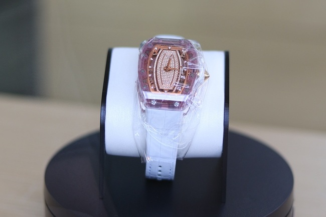 台中分署今天下午舉辦法拍活動,廖女的鑽表成為焦點;負責拍賣的主任執行官先說明,所要拍賣的粉色鑲鑽腕表,藍水晶底蓋有凹痕,缺了2個墊片,不過經確認可送原廠維修,而鑽表網路行情約3300多萬元,今天有設定不公開底價。