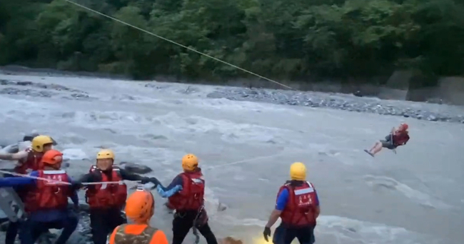 花蓮縣消防局特搜大隊長簡弘丞說,警義消40多人到場時,因水流湍急且雨勢很大,等到雨勢趨緩後,利用空拍機及架設繩索系統,由救難人員協助,晚間6時許順利將受困男子從40公尺寬溪床渡溪脫困。