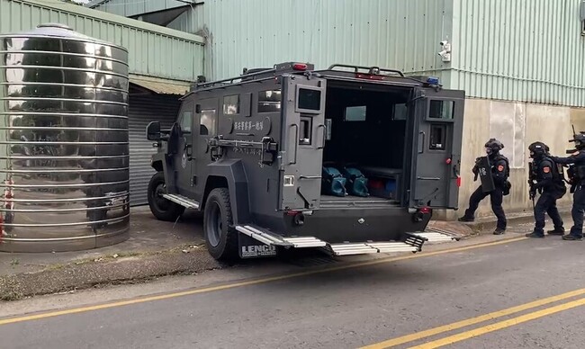 警方以要價新台幣2000萬「Lenco Bearcat G2輪式裝甲車」懸掛破門器材強勢突襲,衝破鐵門瞬間,特警衝入廠內,當時27歲甘男、34歲黃男正忙於製毒,突然一群人闖入工廠內,嚇到倉皇逃竄,2人準備從後門離開,卻已被重重包圍,當場遭警方逮捕。