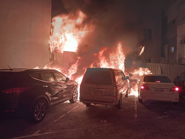 消防局指出,停車場有5輛汽車起火燃燒,機車行為透天厝,3樓為加蓋鐵皮,燃燒面積約25平方公尺,有2名民眾燒燙傷,其中1人拒絕送醫,預估損失約新台幣14萬元。