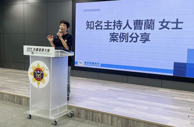 台東縣警察局今天舉辦「一句查證,守住荷包」打詐記者會,邀請移居台東的藝人曹蘭分享自身經驗。