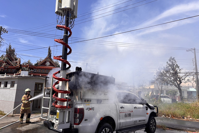 警消人員初步調查,疑似為基地發射通訊車後方附載設備處起火,設備毀損嚴重,確切起火原因及財物損失待進一步釐清。(編輯:陳仁華)1140713