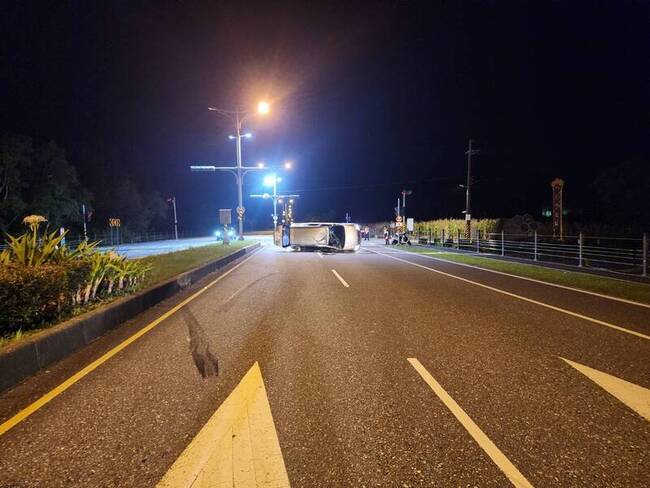 花蓮縣警察局鳳林分局昨晚9時12分接獲通報,光復鄉台9線與尚德街口發生交通事故,警方到場時,一輛5人座自小客車翻覆在車道中間,車內4名大人及3名小孩擦挫傷。