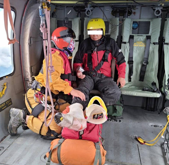 花蓮縣消防局申請空勤支援,空勤總隊花蓮駐地今天上午9時許出動黑鷹直升機前往救援,因傷者位處斜坡地且雲瀑不斷湧進,增加救援困難。