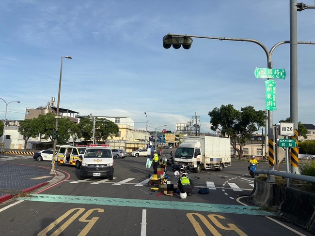 (中央社記者管瑞平苗栗縣9日電)蔡姓男子今天上午6時許駕駛大貨車行經苗栗縣苗栗市經國路與新東大橋路口時,疑未遵守號誌左轉,撞上對向直行機車,機車騎士及後座乘客遭撞飛,暫無生命危險,由救護車送醫。