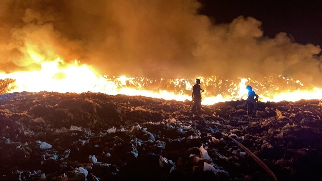 縣府指出,凌晨獲報新豐垃圾掩埋場發生火警,立即由消防局派遣人車前往搶救,共部署4條水線配合5台怪手、1台消防機器人及空拍機,上午9時20分已將火勢撲滅,持續進行殘火處理。