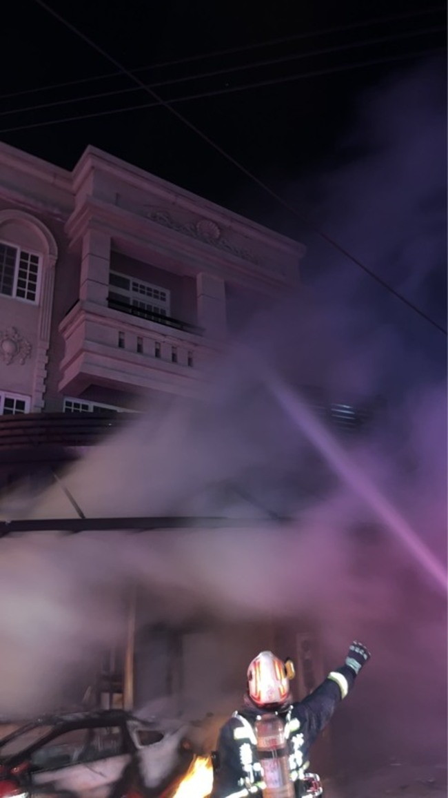 警方表示,起火民宅為地上3層樓RC構造建築物,1樓客廳有火煙竄出,6名民眾於室內待救,其中4人位於3樓、2人在頂樓;另有3名民眾已自行逃生。