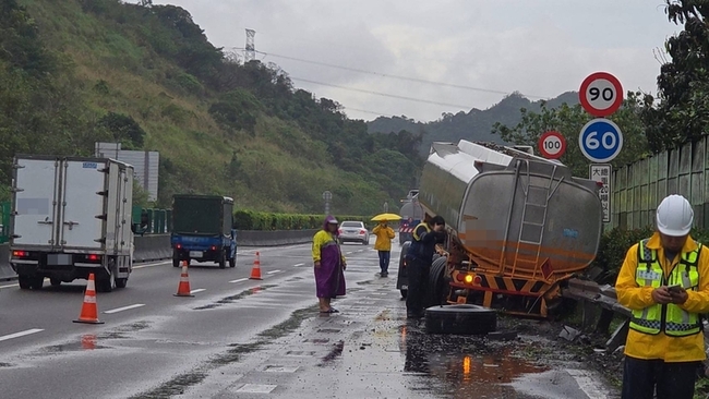 警方初步了解,黃男駕駛營業半聯結車載運間二甲苯,從中部出發要到宜蘭,行經國道1號北向8.8公里五堵路段,疑似恍神不慎自撞外側護欄,因需要先將間二甲苯移至另1個槽體,才能接續展開拖吊作業。
