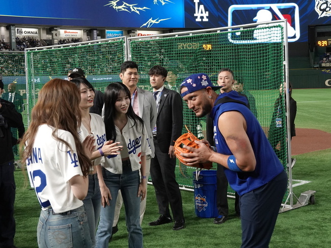 同樣引起騷動的還有女團MISAMO,球迷不斷呼喊3名成員Mina、Sana和Momo的名字,3人也親切揮手致意。3人今天都是道奇球衣加上牛仔褲勁裝,準備擔任開球嘉賓。3人還接受道奇內野手羅哈斯(Miguel Rojas)的投球指導,並一起自拍。