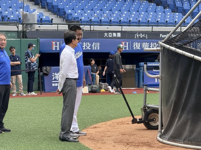 富邦集團董事長蔡明忠親自到新莊棒球場勉勵球員、教練,也踏上球場稍微看了賽前練習,並與總教練陳金鋒、領隊林華韋、執行副領隊郭泰源、副領隊林威助談話。