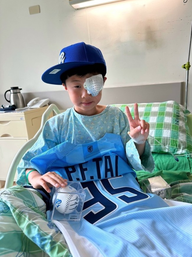 (中央社記者楊啟芳台北8日電)中職昨天在新莊棒球場的賽事,觀眾席上有小球迷被界外球打中眼部、當場見血,富邦悍將球團今天表示,為了表達關心,帶著全隊簽名球棒、球衣等到醫院探望,盼他早日康復。