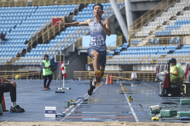 台北國際田徑公開賽今天進行最後1天賽事,以8公尺40成為全國男子跳遠紀錄保持人的林昱堂,在資格賽準備開始前,現場突然下起大雨,他的第1次試跳就是在雨中完成。