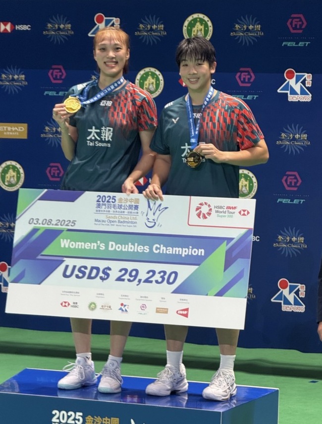 世界羽球總會(BWF)女雙世界排名第12的台灣組合謝沛珊、洪恩慈,今天在超級300的澳門羽球公開賽女雙決賽,以21比18、21比12輕取日本搭檔大澤佳步、田部真唯,拿下自今年5月台北公開賽以來的第2座冠軍。