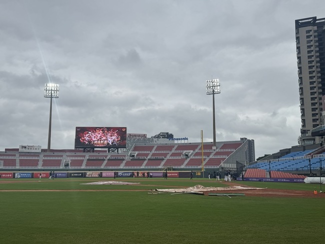 中職總冠軍賽(台灣大賽)前3戰在台北大巨蛋都順利完成,目前樂天桃猿2勝、中信兄弟1勝,原本在桃園棒球場的第4戰要在22日進行,不過近日雨勢不斷一口氣延了4天。今天雖然桃園球場仍是陰天,不過雨勢停歇,場務人員早上9時就開始整理積水的場地。