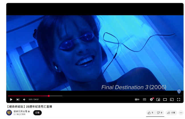 自《絕命終結站》首集於2000年上映以來,就以腦洞大開的死法聞名影壇,像是經典的日曬機、電影院、球場、倉庫等地方都出現過各種意外死法,超有創意的劇情培養出一群死忠影迷。甫結束的25週年直播上也有不少台灣粉絲加入討論,許多觀眾對系列電影的死法如數家珍,也有人表示這系列電影讓他們的生活處處充滿恐懼,驚呼「至今不敢做近視雷射」、「當初看完電影,連開車都會怕」、「因為這些電影而不敢搭飛機」,足見這系列電影給觀眾帶來多少陰影。