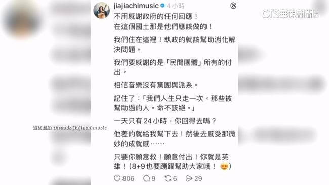 家家日前在threads表示,花蓮救災重建「不用感謝政府,那是他們該做的」,相關言論遭到網友撻伐後緊急刪文道歉,但後續回覆網友的對話內容也再度挨轟。家家昨(27)日舉行演唱會,唱完第一首歌後就再度道歉,表示他會管好自己,家家也再度感謝稱讚所有投入救災的人員都是無名英雄。