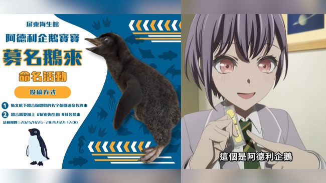 屏東國立海洋生物博物館於今年迎來一位新成員-阿德利企鵝寶寶,海生館昨(25)日於臉書發起「募名鵝來」命名活動,隨即吸引不少「BanG Dream!」粉絲留言。
