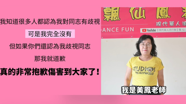 社群帳號「飄仙鳳舞」的美鳳老師時常用簡單的舞步,教導時下最流行的韓團舞蹈,獲得不少網友喜愛,而美鳳老師近日被爆出,在參加商演後抱怨「如果知道是同性戀活動就不接了」引發熱議。對此,「飄仙鳳舞」則多次回覆留言澄清,而稍早也發出圖卡表示「我知道很多人都認為我對同志有歧視,可是我完全沒有,但如果你們還認為我歧視同志,那我就道歉,真的非常抱歉傷害到大家了」。