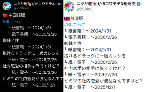 ニクヤ乾日前在X平台上發文提到自己將與「Core Magazine」解約,並附上自己出版的作品及各國語言版本,其中在台灣出版的作品中,ニクヤ乾打上「中文版」並用了五星旗。
