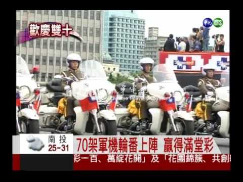 空中分列式,旋翼機整齊劃一飛過總統府;光這樣不夠,IDF幻象2000緊接上場,讓民眾驚呼連連;七十架戰機飛越台北上空,為雙十國慶點綴的更加美麗;壓軸雷虎小組噴出代表國旗的紅、藍、白三色煙,為三分鐘空中分列式畫下句點。