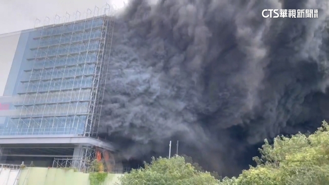 濃煙惡火中火光竄出,火勢快速蔓延吞噬掉興建中的廠房,黑煙集中在其中一側,源源不絕向外竄出,所到之處讓人看不清東西,從鷹架圍欄到屋頂上放置的建材,都能看出工程還在進行中,翻捲的濃煙遮蔽了視線。
