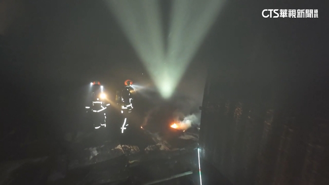 消防人員,挺進廠房內部搜救,只見還有殘火持續燃燒,內部建材,被燒到扭曲變形,漆黑的廠房中,消防人員靠著頭燈照明,持續尋找受困工人,受困工人家屬說:「他們是水電工。」受困工人家屬說:「我是剛才接到通知,4點多。」受困工人家屬說:「(然後就來這邊等),他叫我來現場。」