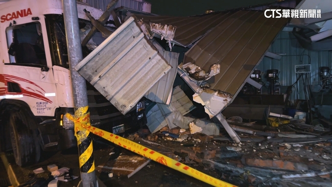 車禍現場,貨車車頭撞進工廠後門,車體零件和號誌燈散落在馬路上,工廠後門被撞出一個大洞,地上到處是磚頭、鋼筋,電線垂掛在空中,後門的鐵皮屋頂被撞塌,其中一根鋼樑,還插進貨車車頭。現場民眾說:「脫困了嗎?」鋼樑不偏不倚插在駕駛座上,駕駛幸運躲過一劫,自行脫困,因為腹部和胸部疼痛,被緊急送醫。