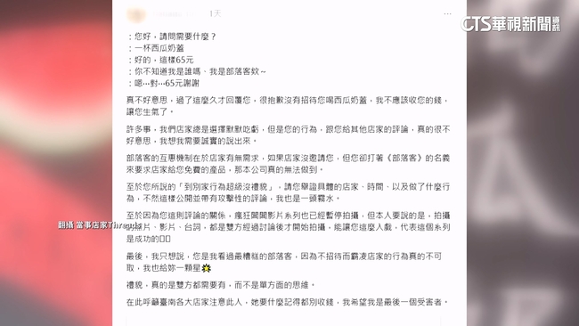 因為拒絕招待而被留負評,店家也不忍了直接公布,還很酸的寫下不好意思,過了這麼久才回覆您,很抱歉沒有招待您喝西瓜奶蓋,台南市飲料店老闆吳承灃說:「(在地)有些商店,大家都有遇過他,所以大家都不敢講話。」其他顧客說:「打著部落客(之名)來騙吃騙喝的,也很多啦,你去要求(免費招待)就不太好。」