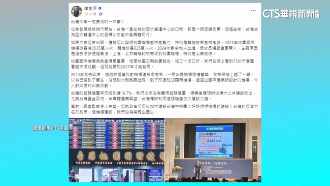 旅遊唸書做生意,外國旅客抵達台灣的第一站,桃園機場但身為國家的門面,這裡卻處處備受質疑,喀擦謝金河貼文,財信傳媒董事長謝金河,在臉書發文點名桃園機場,說三期航廈施工一波三折,可能到2027年才啟用,還舉例印度機場當作對比,認為經由國際建築師設計,讓人對印度的印象改觀,文末寫下台灣的經濟力名列前茅,但是在機場建設卻沒展現企圖心。