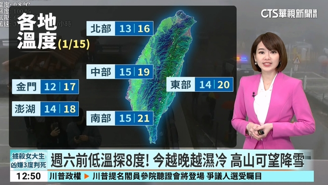 關心今天的天氣囉,今天上班日,但合歡山武嶺上頭還是有很多人,因為今天早上一度下起了白雪夾雜冰霰!我們趕快來關心天氣。今天大陸冷氣團南下,氣溫冷得很有感,尤其在南部,高溫也只有21度,而且入夜後越來越冷,下班一定要穿溫暖。而且不只冷,全台幾乎也是溼答答,東北部最為明顯,要到明天才會趨緩一些。而今天因為水氣加上低溫,所以中部以北3500公尺以上的高山,有下雪的機會。那會冷到什麼時候呢?得一直到禮拜六冷氣團減弱,才會逐漸回溫,期待這幾天的打拼能有個舒服的周末假日囉!以上天氣提供給大家。