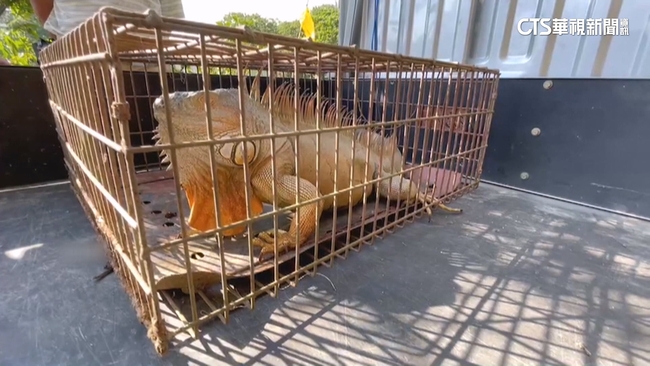 記者蘇宜庭說:「綠鬣蜥時常會在溪邊出沒,里長的工作五花八門,現在可能還得多一項,抓綠鬣蜥的技能。」高雄鳳山北門里里長謝秀霞說:「先把綠鬣蜥逼到牆角去,然後用這個籠子把它蓋住。」