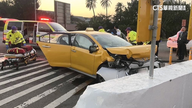 警方VS.記者說:「這只是單純,這樣也能撞。」計程車駕駛疑似打瞌睡,沒注意前方狀況,開在彎道卻直直走,最後撞上分隔島,救護人員和警方趕到現場,計程車裡頭還有乘客,而司機已經昏迷了,撞擊力道之大,計程車引擎蓋毀損嚴重,車頭燈碎裂後照鏡也折損。
