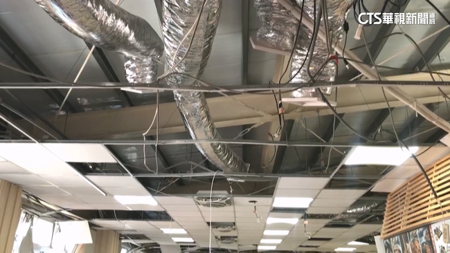 天花板的矽酸鈣板掉落,管線外露,電線垂落在半空中,位在台南玉井這間知名的蕎麥觀光工廠,地震過後,館內受損嚴重滿目瘡痍,業者無奈忙著整理,水塔倒塌,園區內沒水可用,牆壁坍塌現場貼著,維修中暫停營業的公告。
