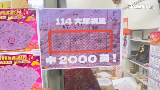 這家彩券行可說是旺到不行,從除夕前就連續開出大獎,從10萬100萬一直到2千萬,業者將中獎的彩券放大列印,貼在店門口,開出大獎後老闆說生意變得更好,笑得合不攏嘴,彩券行業者說:「生意好,過年那時,人要進去裡面,都沒辦法進去。」過年民眾買彩券做公益,被幸運之神眷顧,將豐厚獎金帶回家。