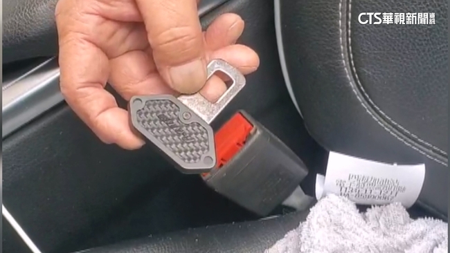 員警說:「(安全扣)有在,有沒有斷掉,我看有喔,斷掉嗎,沒有,他用這個假的。」檢查車輛以為是安全帶斷裂,沒想到反覆檢查,原來插座上只有一個消音扣,這個東西原本是設計用來,載重物時避免發出警示音,記者游育驊說:「開車載重物,無法繫上安全帶,車輛感受到重量就會逼逼大響,因此這個消音扣一插上去,聲音就沒有了,但是卻有人拿來載人,恐怕也會吃上罰單。」