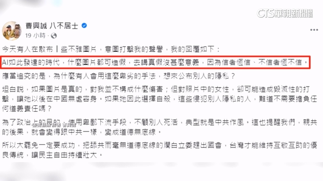 媒體人謝寒冰說:「她其實跟中國共產黨也有部分關係,她也經常參加中國共產黨辦的一些活動。」對於爆料曹興誠臉書發文回嗆,AI如此發達的時代,什麼圖片都可造假,去講真假沒什麼意義,也強調會提告,謝寒冰也在臉書發文想告就來告啊。