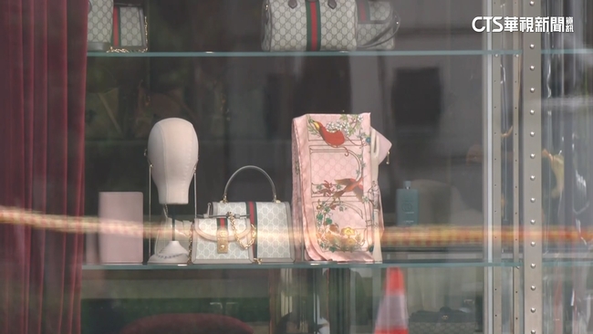 台中新光三越,一樓精品櫃GUCCI,玻璃櫥窗內,架上還擺放著好幾個名牌包,氣爆影響,整棟百貨外拉起封鎖線,這些精品包包拿不走,暫時都不能販售。