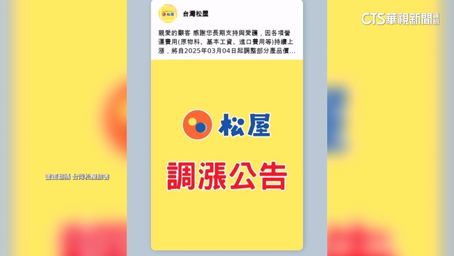 「台灣松屋」昨天發出公告,表示由於各項營運費用持續上漲,將從今天起調整蓋飯、定食及部分單點的價格,不過公告中並未提到調漲品項及幅度。其實台灣松屋去年2月曾漲價,主要是牛肉飯系列產品漲價,而這次公告中漲價的品項並沒有寫出牛肉飯,而是以蓋飯、定食及單點為主。