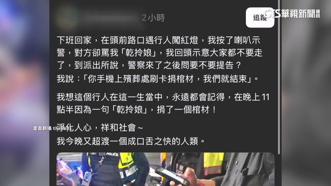 當事人楊先生說:「我就問那個當事人,那個行人,就說,你有沒有信用卡,你現場,你上殯葬處的網頁,你現場捐款,捐一個棺材,我們就和解。」要行人捐棺材記取教訓,畢竟公然侮辱罪成立,可能面臨拘役或9,000元以下罰金,行人立刻拿起手機刷卡捐款2000元。