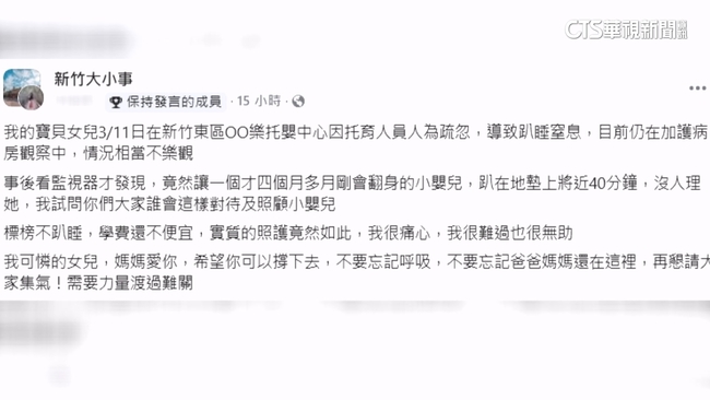 新竹市一間私立托嬰中心,一名4個月大的女嬰,疑似托嬰人員的疏忽,因為趴睡導致窒息,情況相當不樂觀,社會處接獲報案,立即啟動調查,帶您聽一段市府說明。
