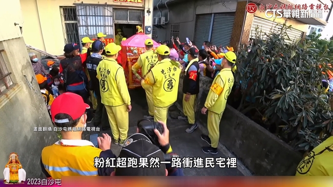 駐駕在原本的停車位上,加上媽祖的招牌粉紅遮雨布,以及行進速度相當快,從此就被封為粉紅超跑,這輛粉紅超跑不只到處跑,還專門挑戰高難度停車,民眾:拜託進窄門,信眾虔誠祈求,粉紅超跑果然一路衝進民宅裡,只差一點點就進不了窄門,進門之後還要360大迴轉。