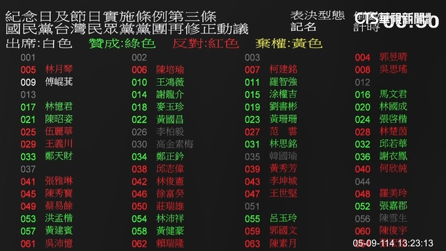 立法院長韓國瑜說:「紀念日及節日實施條例,制定通過。」議事槌一敲下,台下爆出如雷掌聲,立法院會三讀通過「紀念日條例」,未來國定假日將新增「4+1」天,包括9月28日教師節,10月25日光復節以及5月1日勞動節等,但仔細看,牆上的表決紀錄,綠色的是贊成紅色的是反對,而持反對意見的都是民進黨,也遭到民眾質疑,是有多不想讓大家放假。