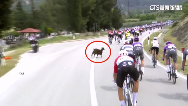 從畫面上可以看到,一大群單車選手浩浩蕩蕩在路上前行。當時比賽進行到第160公里,一頭山羊突然脫離牧群闖入賽道,工作人員連忙上前制止。眼看山羊闖入賽道,選手立刻轉向草地試圖閃避,仍遭到山羊從側面撞擊後輪,讓人看了捏把冷汗,所幸選手、單車還有山羊都相安無事。