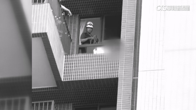 男子蹲坐在陽台上,有員警在一旁,窗戶內也有消防人員,拿著繩索要套住他,但被男子拒絕,而下方一樓外,其他消防人員,則是快動作鋪設氣墊防備,現場周圍也拉起了封鎖線。