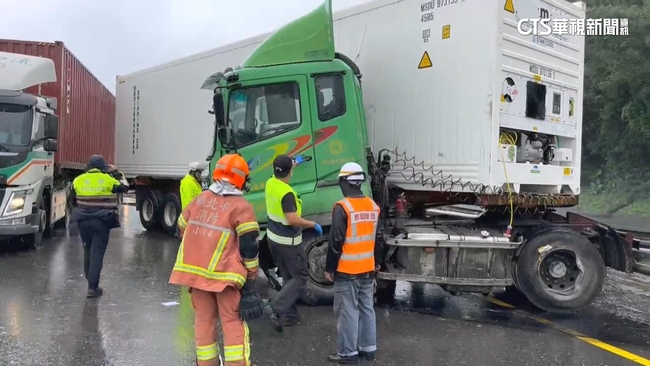 聯結車的車頭和貨櫃幾乎對折,還占據道路,輪胎已經明顯凹陷變形,車殼碎片也散落滿地,救護車,駕駛自行脫困,被送上救護車,回憶起事發經過,真的嚇壞了,肇事聯結車駕駛說:「撞到當下,一片空白,然後打滑,就直接滑掉,然後直接失控,『凹甘蔗』這樣子。」