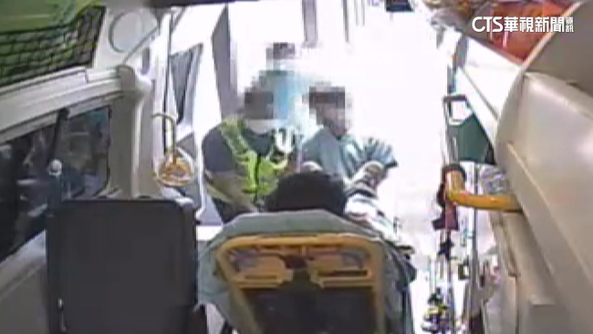 救護人員把擔架從救護車移下來固定好,穿橘色上衣的男子坐上擔架,由救護人員陪同送醫,這名男子是台電的外包商人員,他到大樓施工被灼傷緊急送醫,工安意外發生在台中市北屯區中清路上一棟大樓。