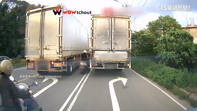 一名機車騎士鑽入前方大車之間的空隙,車縫非常狹窄,當綠燈亮起後,兩輛大車開始移動,騎士卡在中間動彈不得,伸出左腳要穩住重心,還差點被車輪輾過,這驚險的一幕全被後方駕駛行車紀錄器拍下。