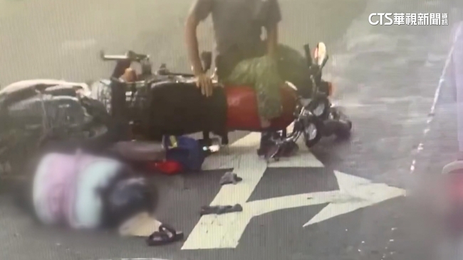 69歲的張姓男子早上7點多騎車轉彎時,和一部直行機車發生碰撞,第一時間他人往後仰,機車在無人操控情況左右晃動,最後人跌坐在機車上,撞他的騎士則是被壓在車底下,而雙方撞擊瞬間,後方有三部機車閃避不及,慘遭波及,總共有5名騎士受傷。