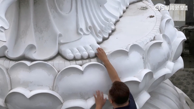 民眾對著8米高的純白觀音像,先是雙手合十跪拜祈福,接著就走上前,用手觸摸觀音像的腳,真正的抱佛腳,民眾說:「可以保佑我可以考試順利啊,一切可以平安順遂,摸著佛腳然後帶著歡喜心,覺得說我們全家,可以得到佛祖的庇佑。」